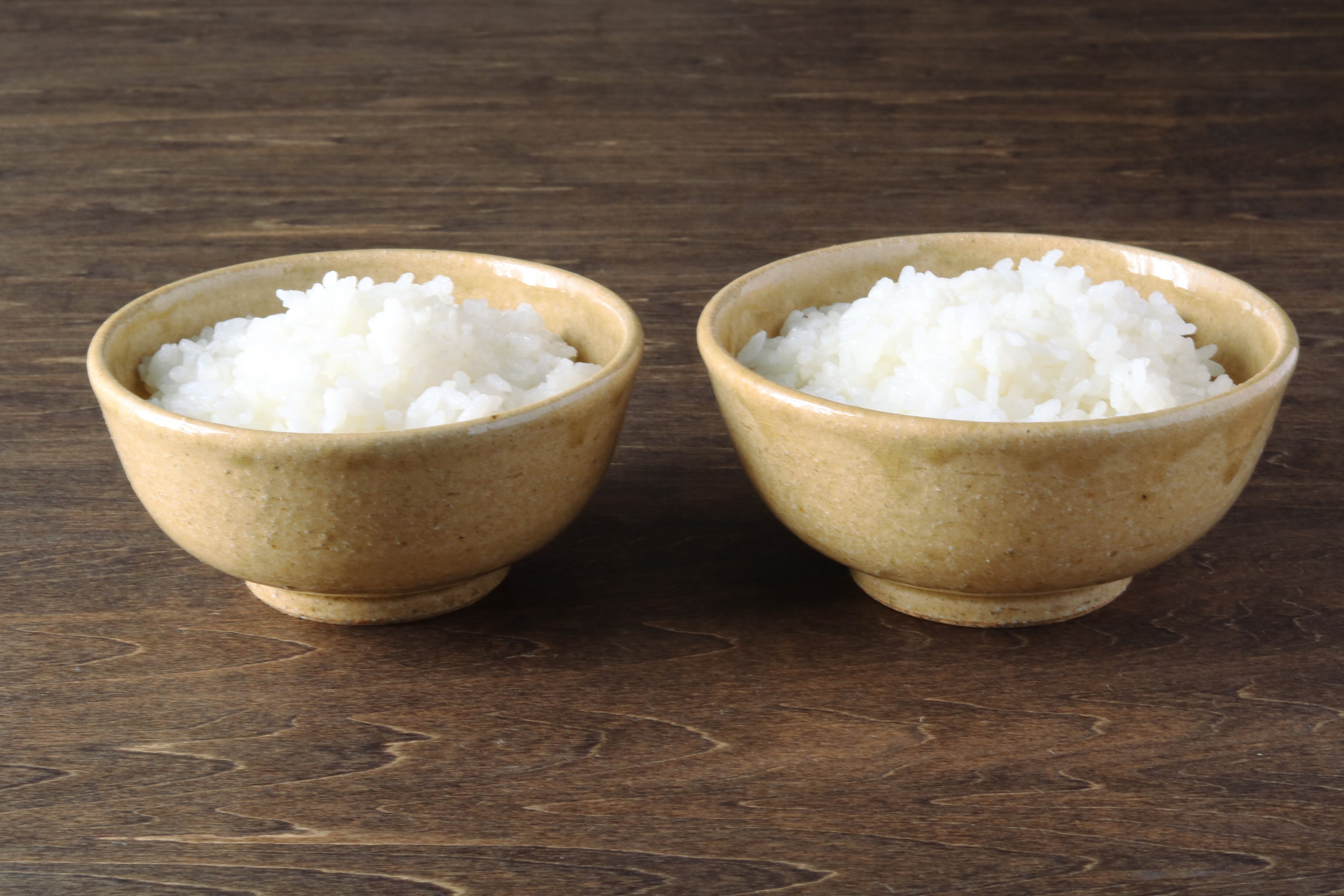 ・2枚目と5枚目の写真は「お茶碗 小」に一般的にカロリー計算をする際に目安とされる、ご飯一杯分150gを盛ったものです。
