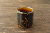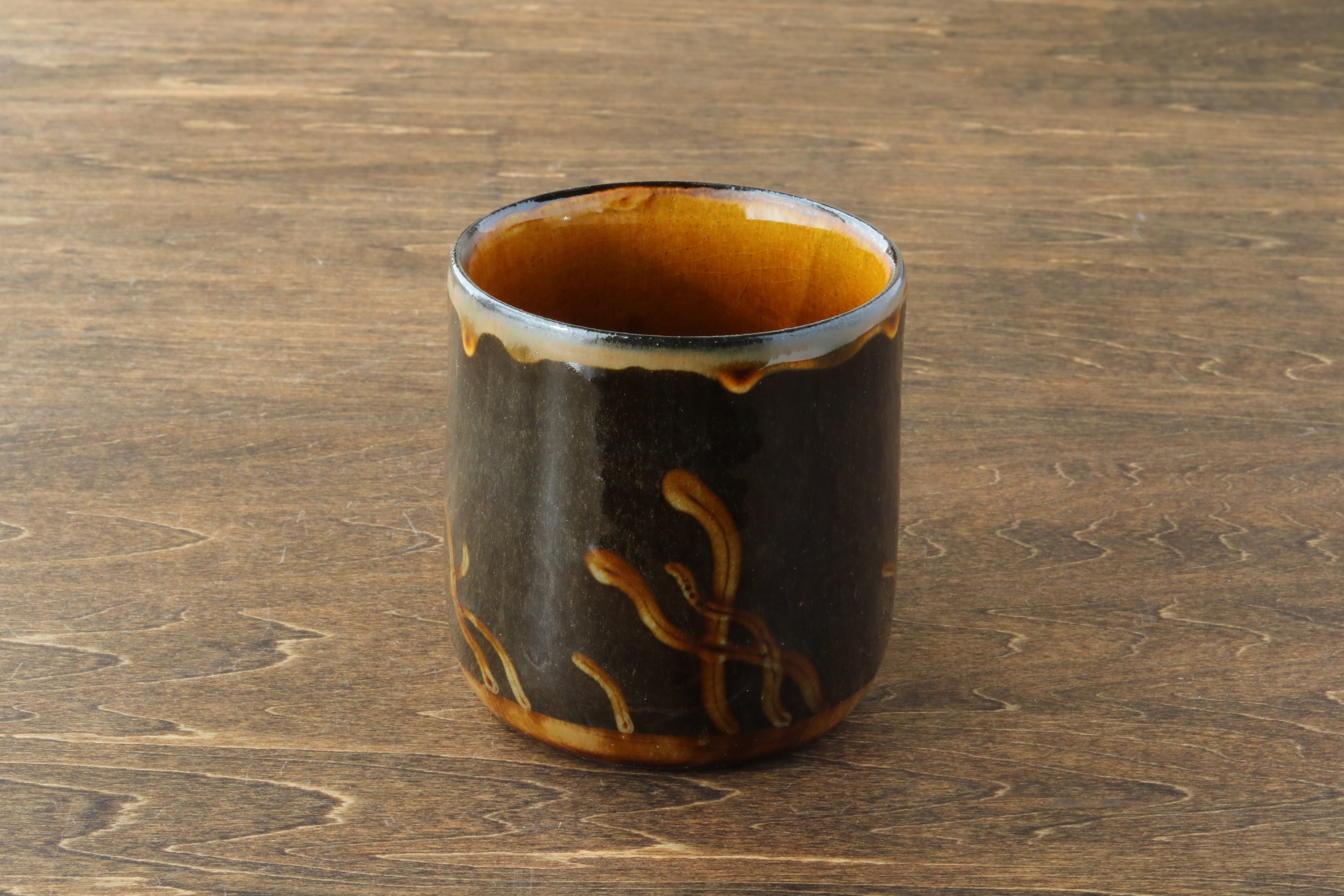 ・スリップウェアのマグカップです。スリップウェアは広く言うと、泥漿(液体状の粘土)で装飾した器です。泥漿を掛けた後に指で模様を描いたり、泥漿をスポイトで垂らして装飾したりします。