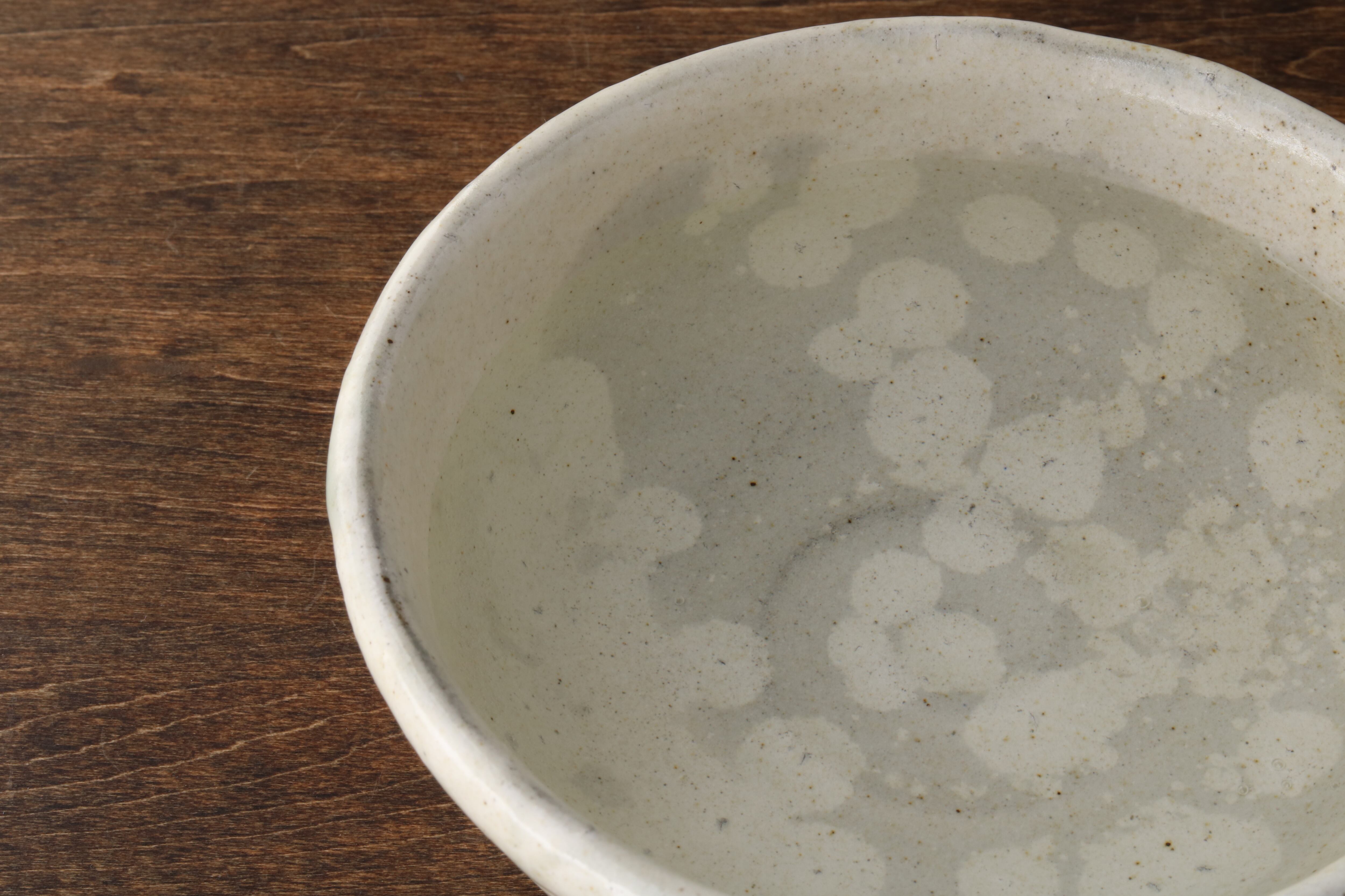 ・6枚目の写真は「小鉢 粉引」に水を注いで10分ほど経った状態です。雨がにじみでたような様子から雨漏り(あまもり)と呼ばれています。素地と化粧土、釉薬の収縮率の違いによって起きる現象で、乾燥すれば元に戻ります。使い続けるうちに少しづつ料理の色が移ってしまいますが、景色として楽しむ文化があります。漂白剤などできれいにすることができますが、気になる方は購入をおすすめしません。